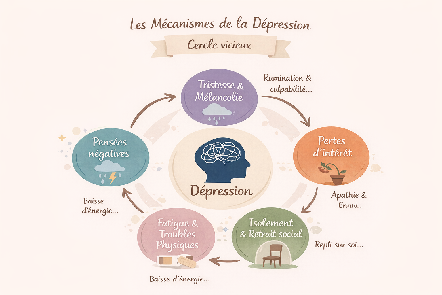 La dépression et l’anxiété peuvent s’installer progressivement, parfois sans que l’on sache mettre des mots dessus. Fatigue persistante, perte d’élan, pensées envahissantes ou sentiment de vide intérieur… Ces états touchent à la fois le mental, les émotions et le corps.